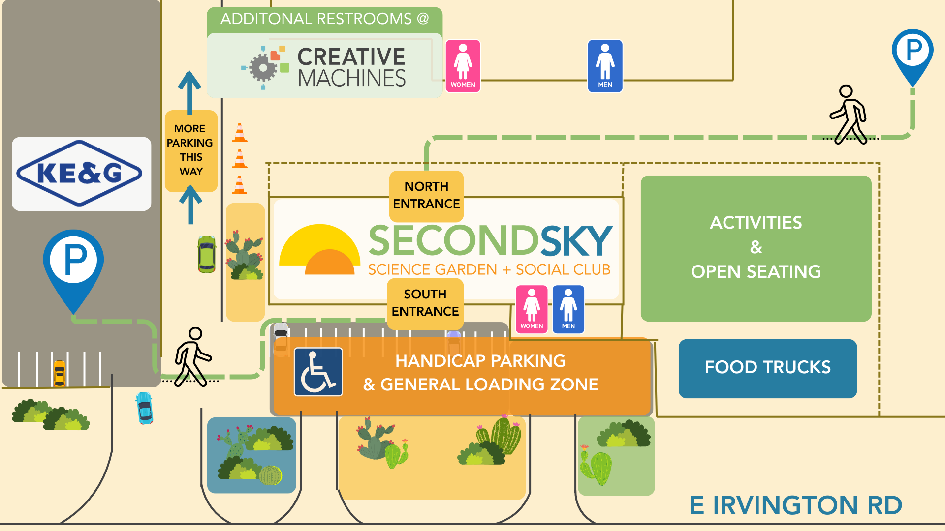 The paved lot is located to the west of Second Sky. If the paved lot is full, additional parking is available in the dirt lot.